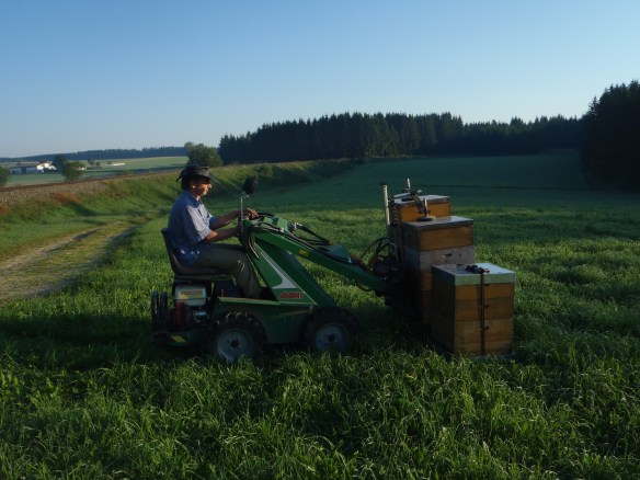Suomea toisinaan kuvataan pitkien etäisyyksien maaksi, mutta etäisyydet tämän tarhaajan mehiläistarhojen välillä olivat melkoiset. Kauimmaiset tarhat, jonne mehiläispesiä siirrettiin, sijaitsivat 150 kilometrin päässä tarhaajan tilalta Waldviertel nimisellä metsäalueella Tsekin rajan tuntumassa. Tämä on yksi niistä alueista, jossa tuotetaan Itävaltalaisten kuluttajien himoitsemaa mesikastehunajaa. Mesikastehunajia on monia erilaisia, sillä laatu riippu mesikasteen erittävästä kirvasta. Itävaltalainen mesikastehunajaa on todella tummaa ja voimakkaan makuista . Suomalaiseen monikukkahunajaan tottuneelle tämä hunaja ei maistunut liian voimakkaan maun takia. Kuitenkin Itävallassa tämä hunaja on kuluttajien suosiossa, ja isäntäni mukaan mitä tummemman väristä sitä parempana hunajaa pidetään. Alla olevassa kuvassa isäntä on siirtämässä pesiä mesikastehunajan tuotantoalueella