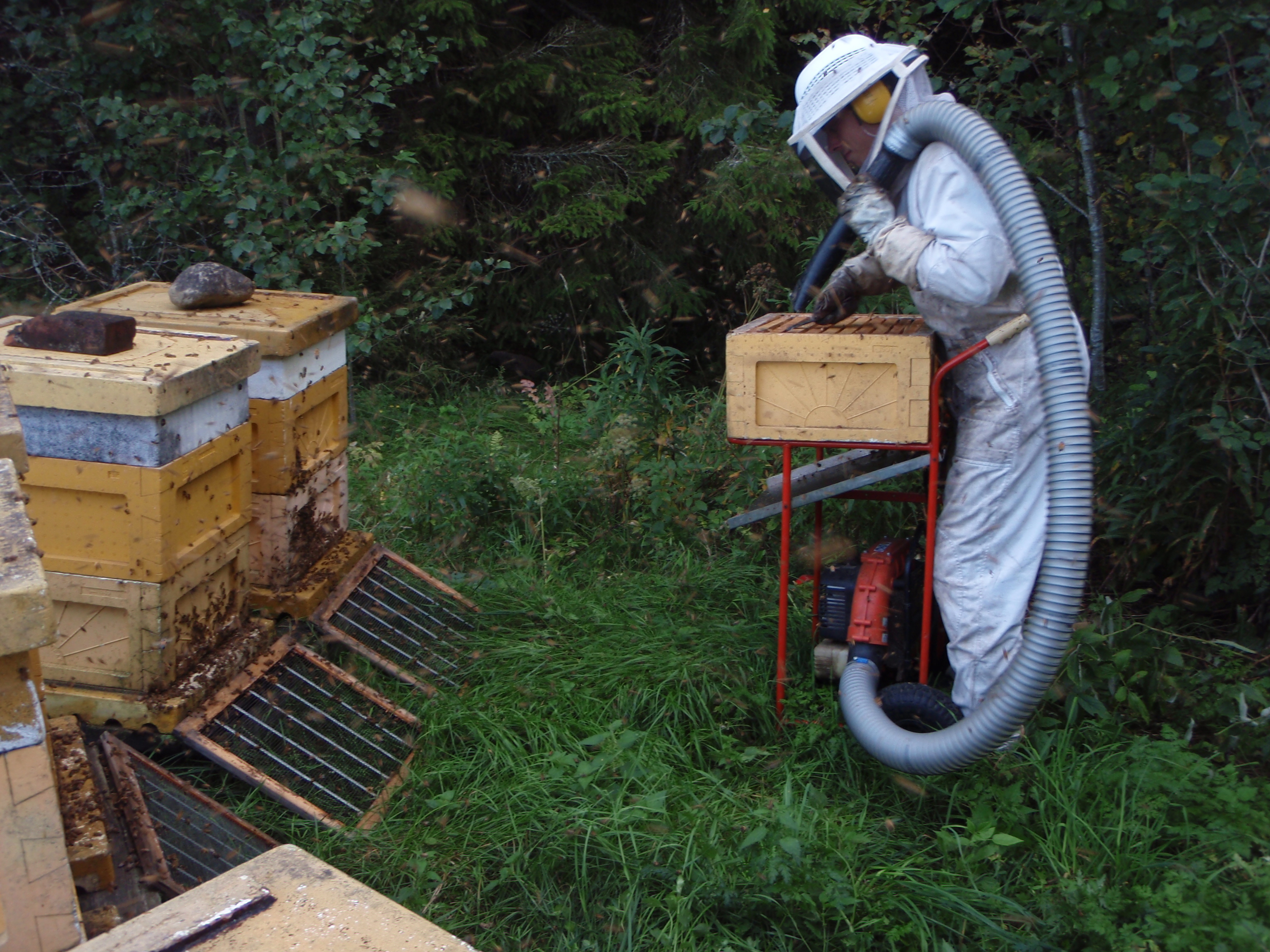 Viime viikkojen aikana mehiläispesistä on kerätty viimeiset hunajalaatikot pois. Tämä vaihe etenee siten, että ensiksi hunajalaatikot nostellaan pesien päältä, jonka jälkeen niistä puhalletaan mehiläiset ulos. Mehiläisten puhaltaminen on välttämätöntä, jotteivat ne turhaan kulkeutuisi aina linkoomoon saakka, vaan voisivat palata takaisin omiin pesiinsä.Image
